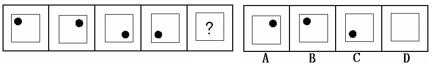 (答案:B。黑點在正方形中順時針移動。在第5個圖形中,應該正好移動到左上角。)